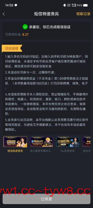优惠:送8 限制:彩金限制电子,10倍流水即可提款 注意事项:注册绑定好信息在优惠里自助申请。有就有没有就无视! ❕不建议充值 黑款自行承担