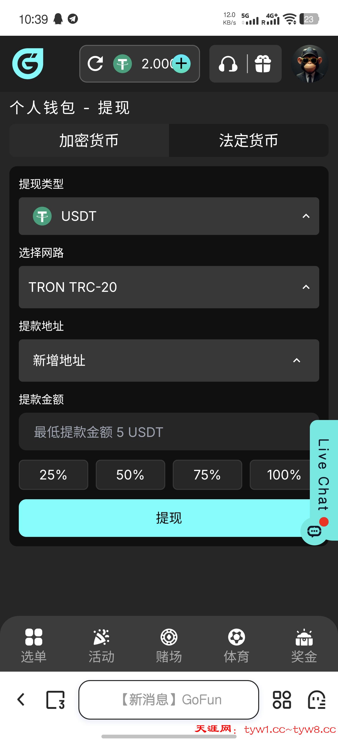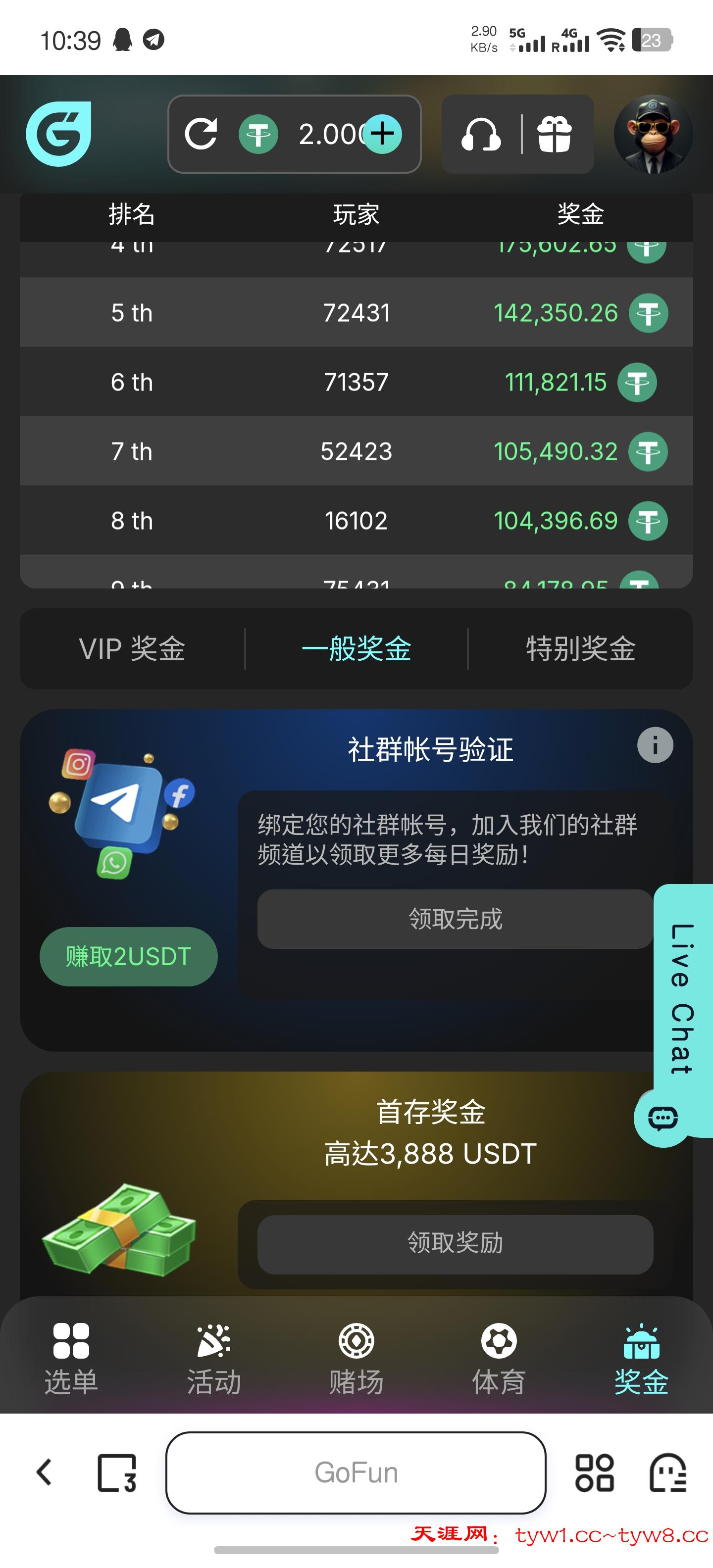 注册后在个人-奖金里找绑定社群账号的任务,3个任务完成领2U。不限场馆1倍水5U起提,我梭哈百家乐第二关没了,所以出款自测