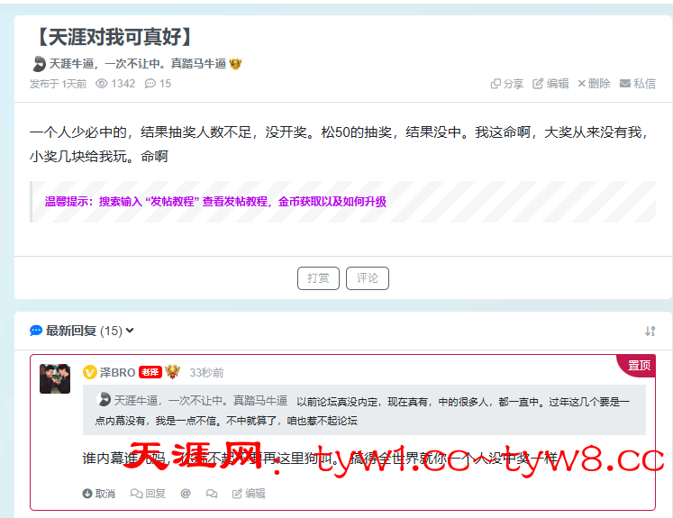 我来天涯那么久一次月福利都没中过,还有春节抽奖也没中 都没叫,只觉得是自己运气不好 你们还叫上了