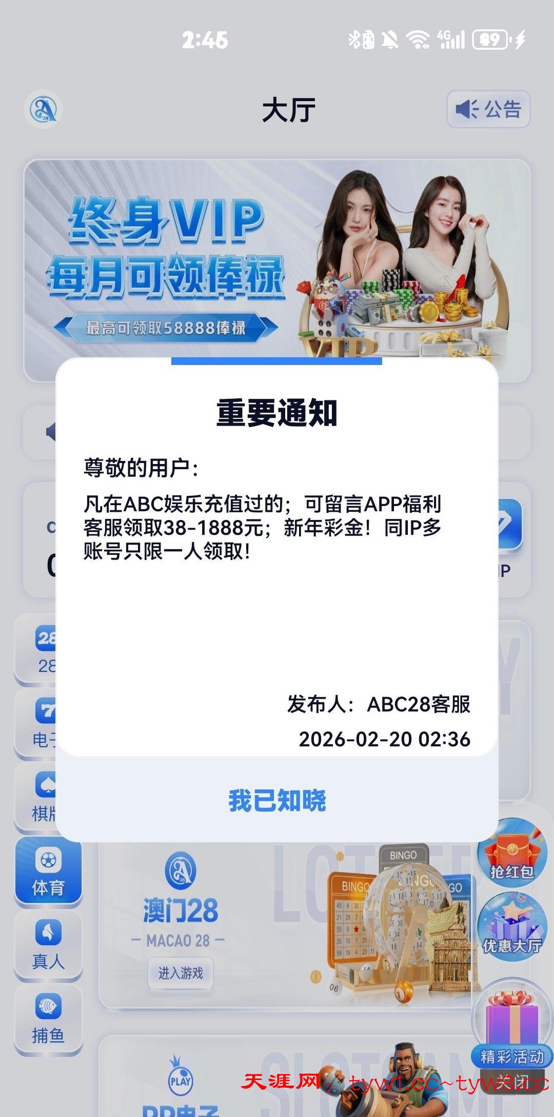 上个月19号领了58,今天月礼金上号看见公告联系福利客服又领了38 链接 abc28.xyz