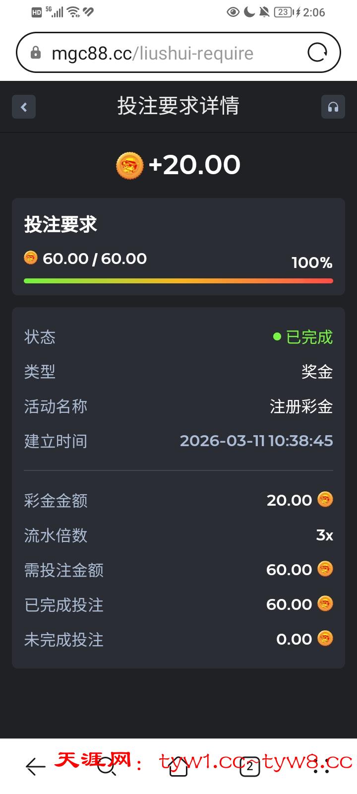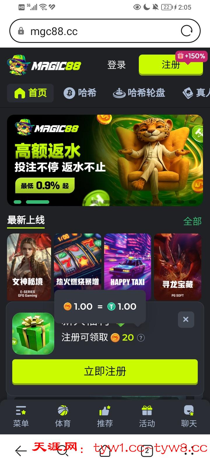 注册秒送20u彩金,打完三倍流水,可以换成5u真钱,可以提现,也可以梭哈再提现.这个查IP很严,如果打完了,他要拉人充100u那就是不行,说明你之前玩过,他之前有个绑定地址送12trx的活动 https://mgc88.cc/