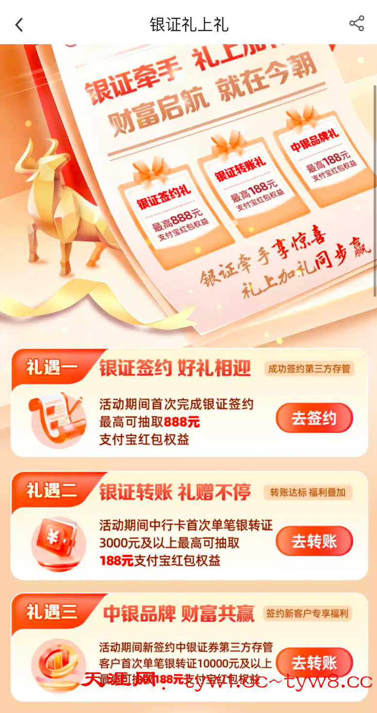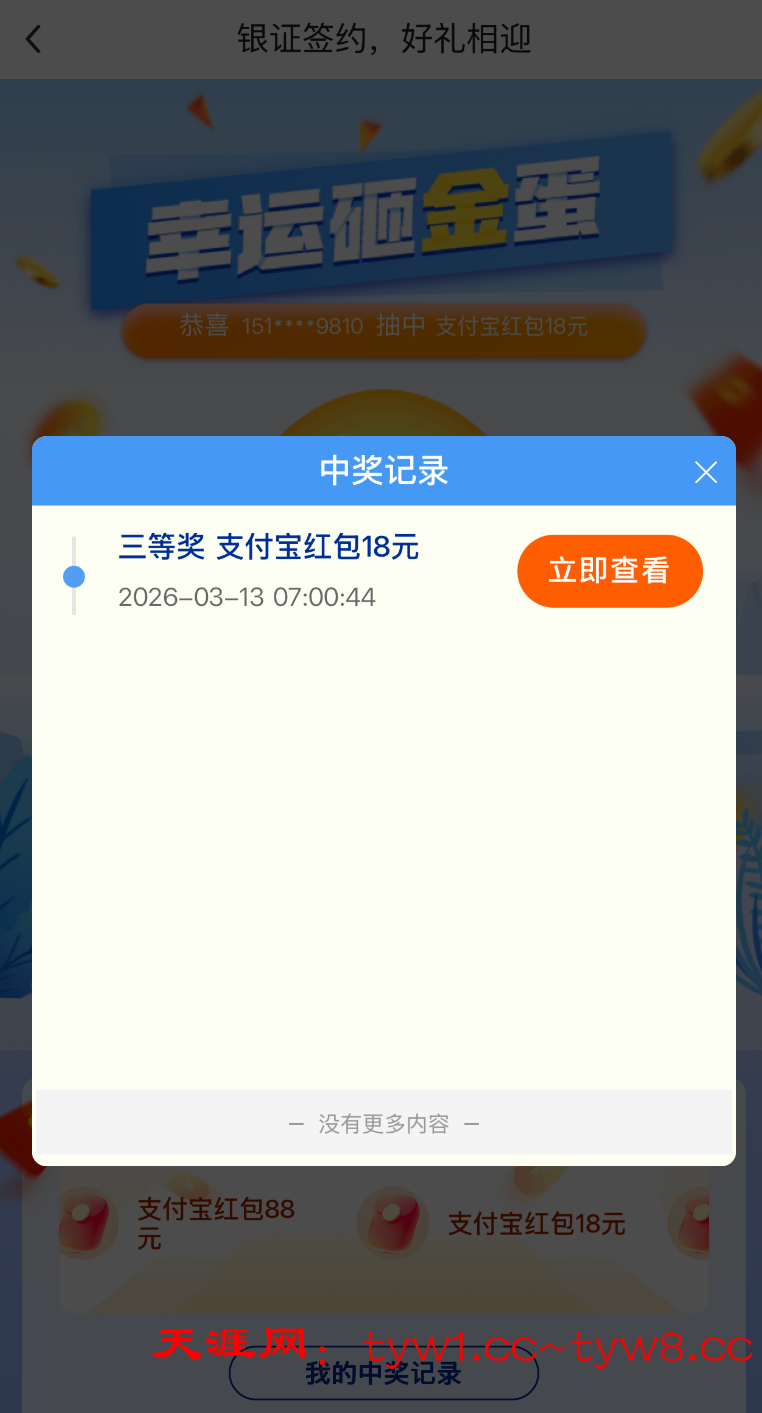 支付宝财富宠粉节,开通过中国银行证劵的,去下载中国银行app,还可以继续抽奖,最少18支付宝红包,最高888。中国银行点进去,首页就会弹出这个银证礼上礼,点进去第一个抽奖就OK。亲测抽到18红包